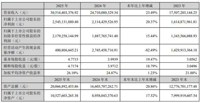 近三年,安克创新营业收入从2023年的175.07亿元增至2025年的305.14亿元,归母净利润从16.15亿元增至25.45亿元,营收与利润复合增长率分别达32.01%、25.53%。